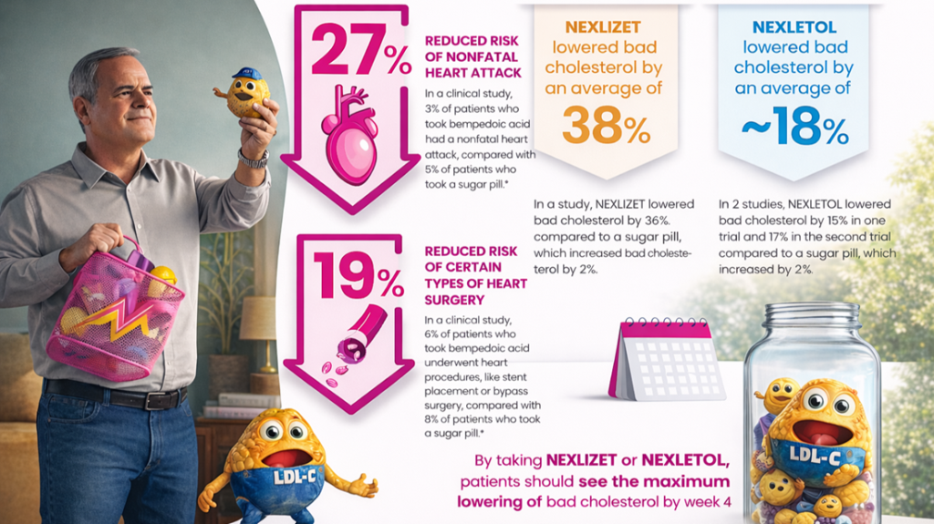The Clinical Result: By attacking cholesterol via both production and absorption, NEXLIZET can lower “bad” cholesterol (LDL-C) by an average of 36% to 38% when added to a patient’s existing routine.
