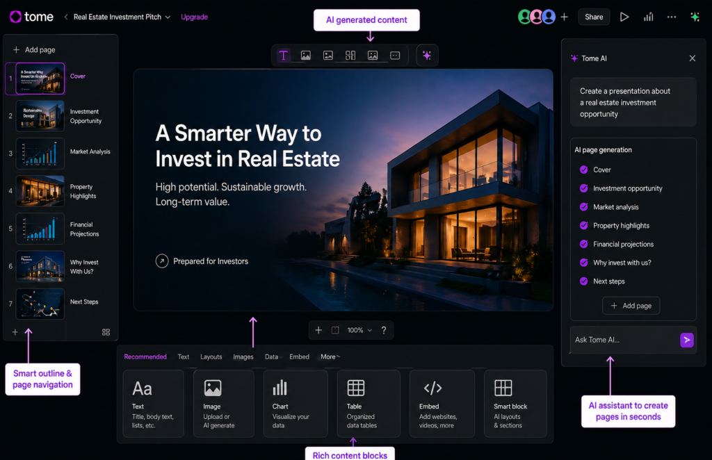 With a simple prompt like “Real estate investment pitch”, Tome instantly generates: